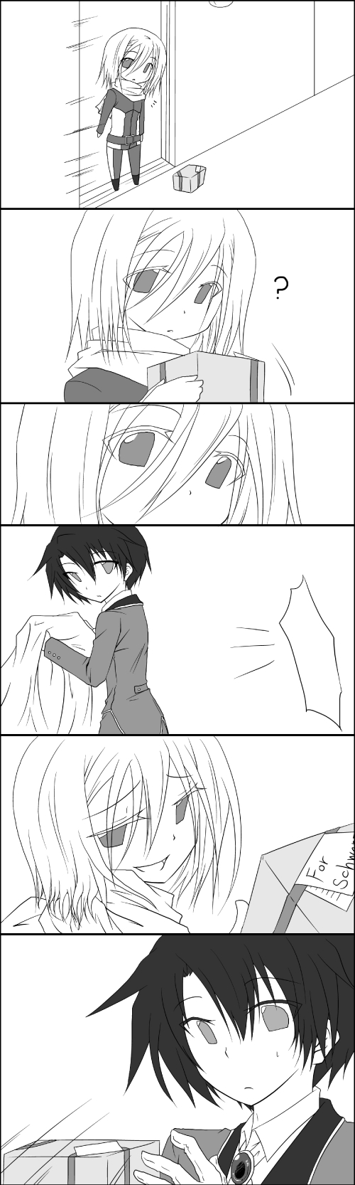 シュヴァルツは自分に対する好意には鈍感そうなので、シリルに「お前にこんなもの渡す人なんて一人しかいないじゃないか」とか言われて気付くかと思われます。
